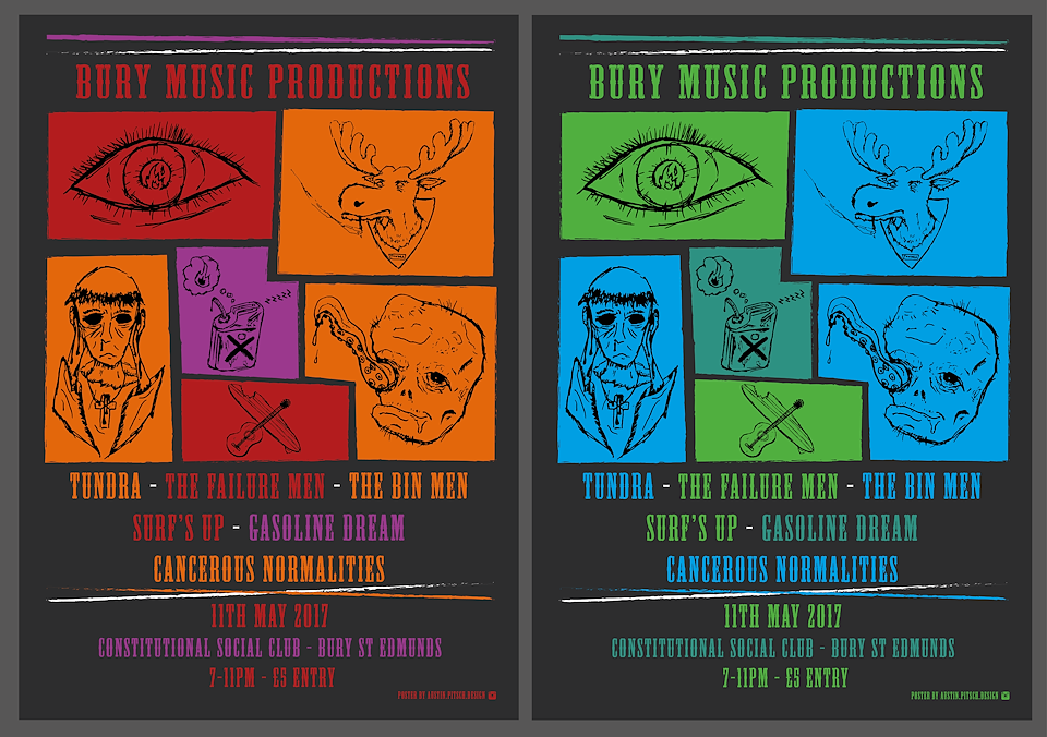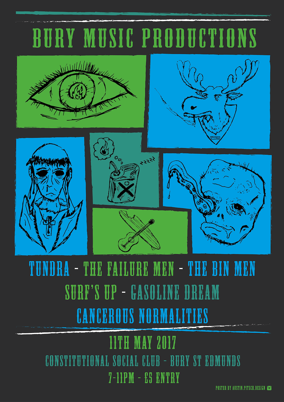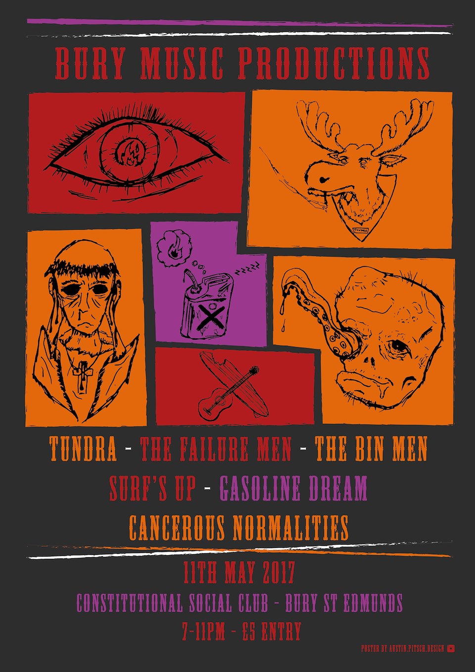 The poster was received so well that Bury Music Productions wanted a short video ad in addition to the posters for their Facebook page. I was sent some footage from shows the bands involved had played at previously and worked them in with my illustrations to create the ad, carrying the same typeface over as well so the branding was uniform.