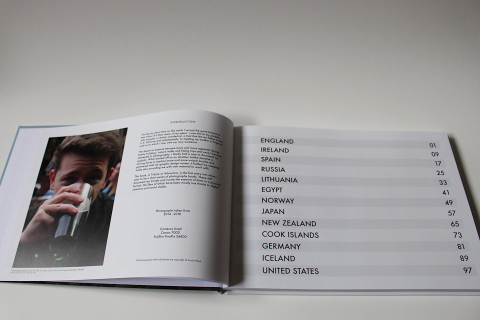 This book, A Tribute to Adventure, is the first entry into what I plan to be a series of photograhy books. These will document my travels and curate the essence of them in a physical format, the likes of which have been mostly lost thanks to digital cameras and social media. It’s what I regard as the culmination of my favorite skills I practice as a graphic designer: design, layout, multi-page media arrangement, photography, typography and copy writing.