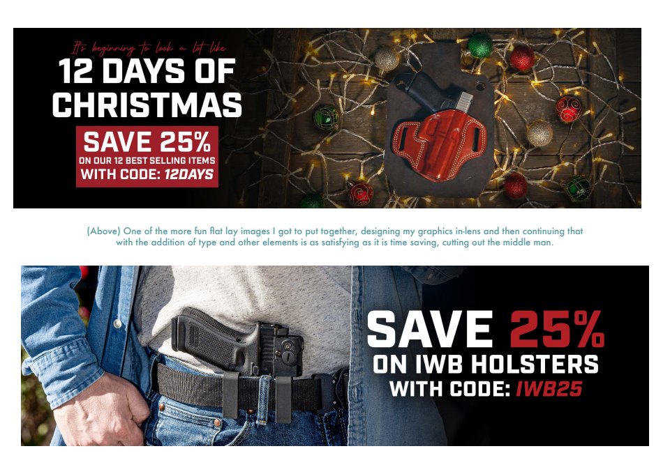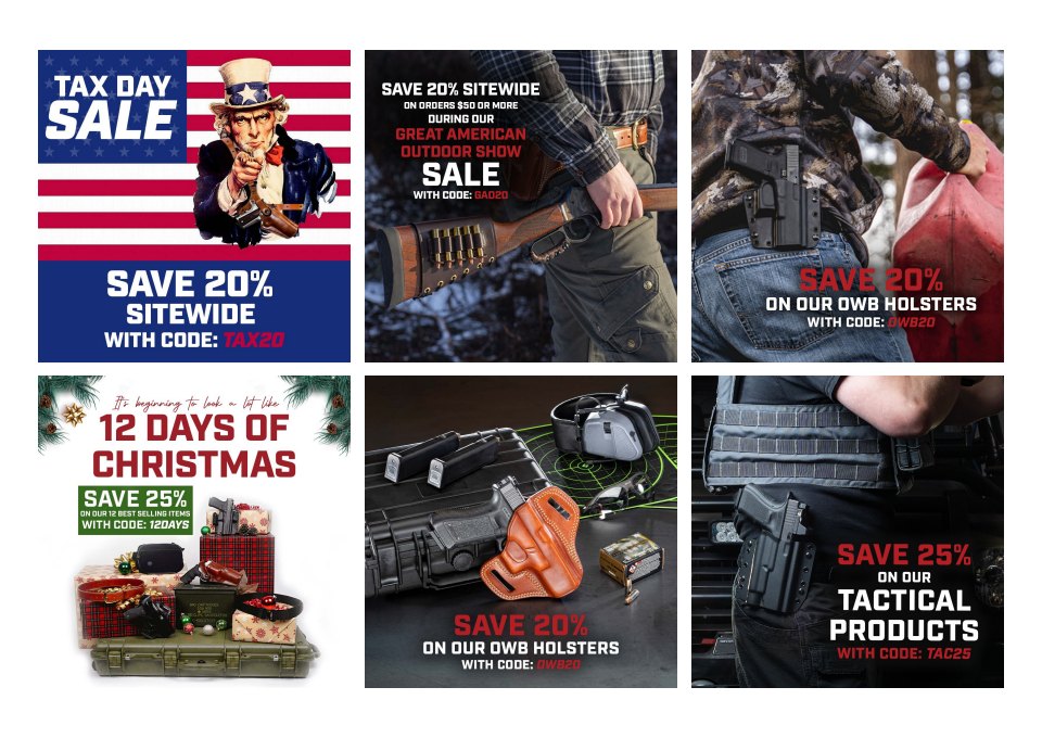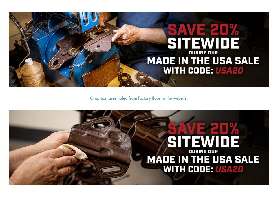 My current primary duty at Galco Holsters is putting together digital material to promote Galco’s weekly sale. This involves putting together graphics for the main company website, all social media platforms including story posts and the email campaign.