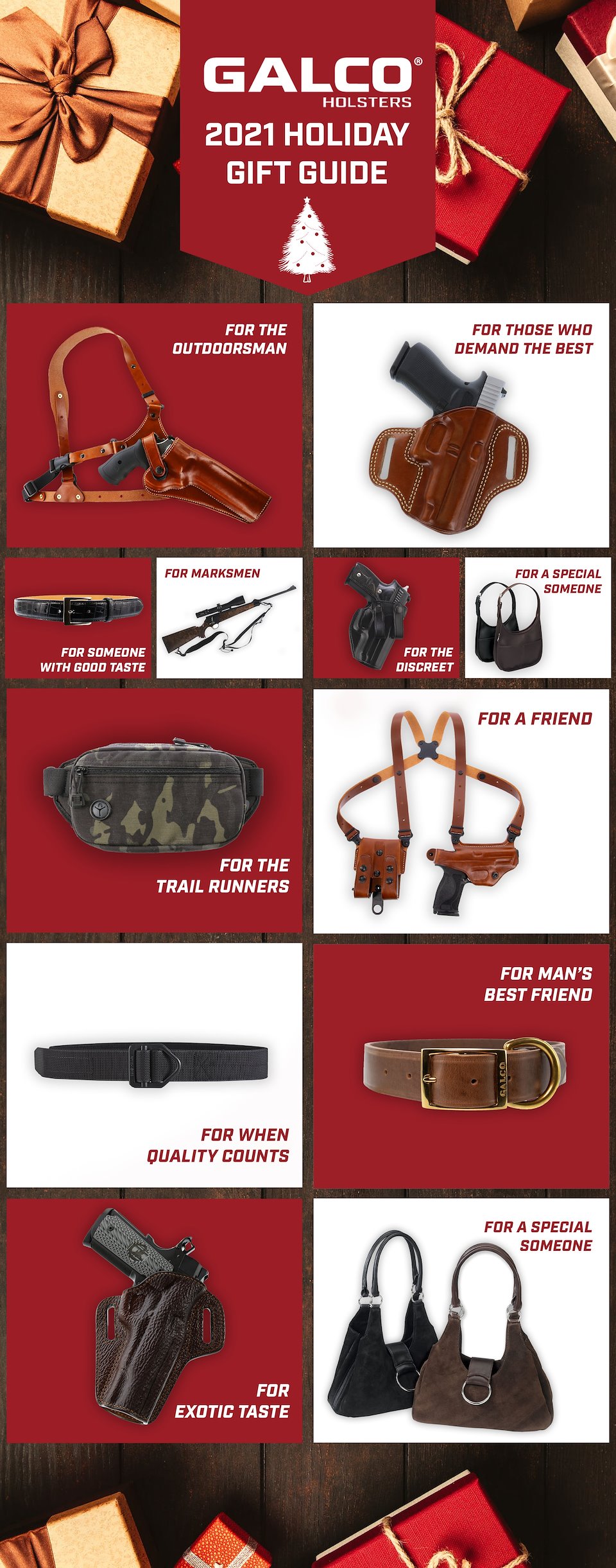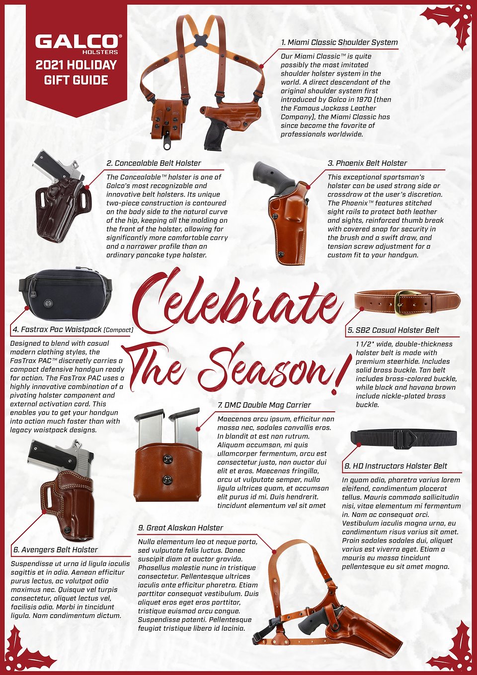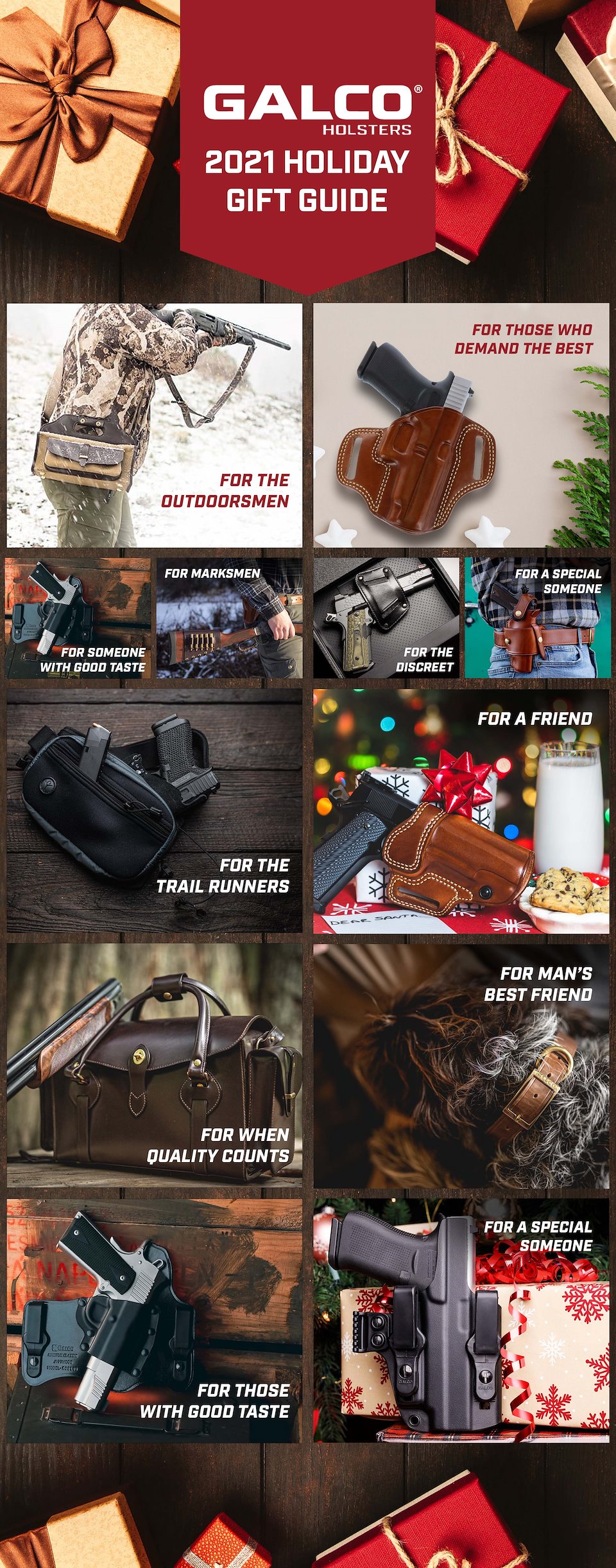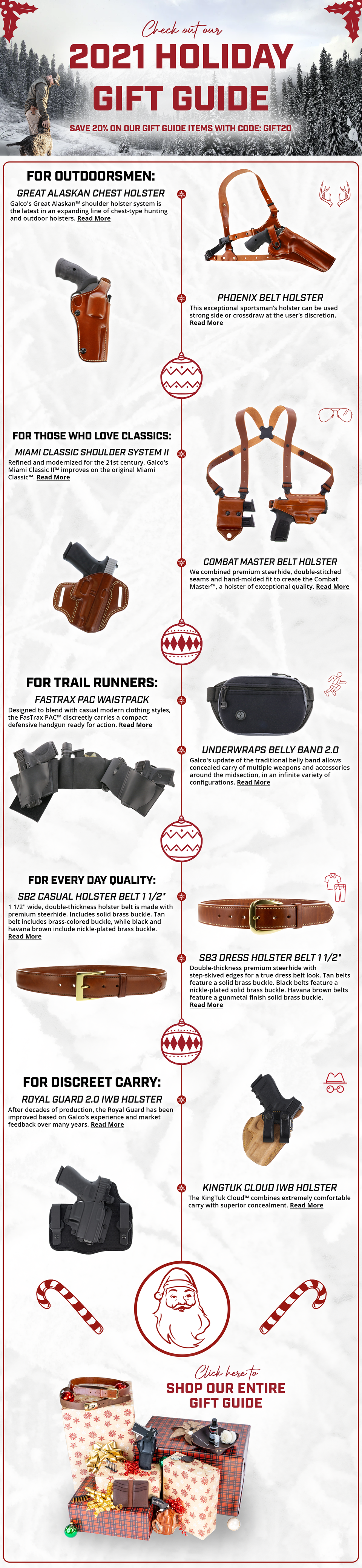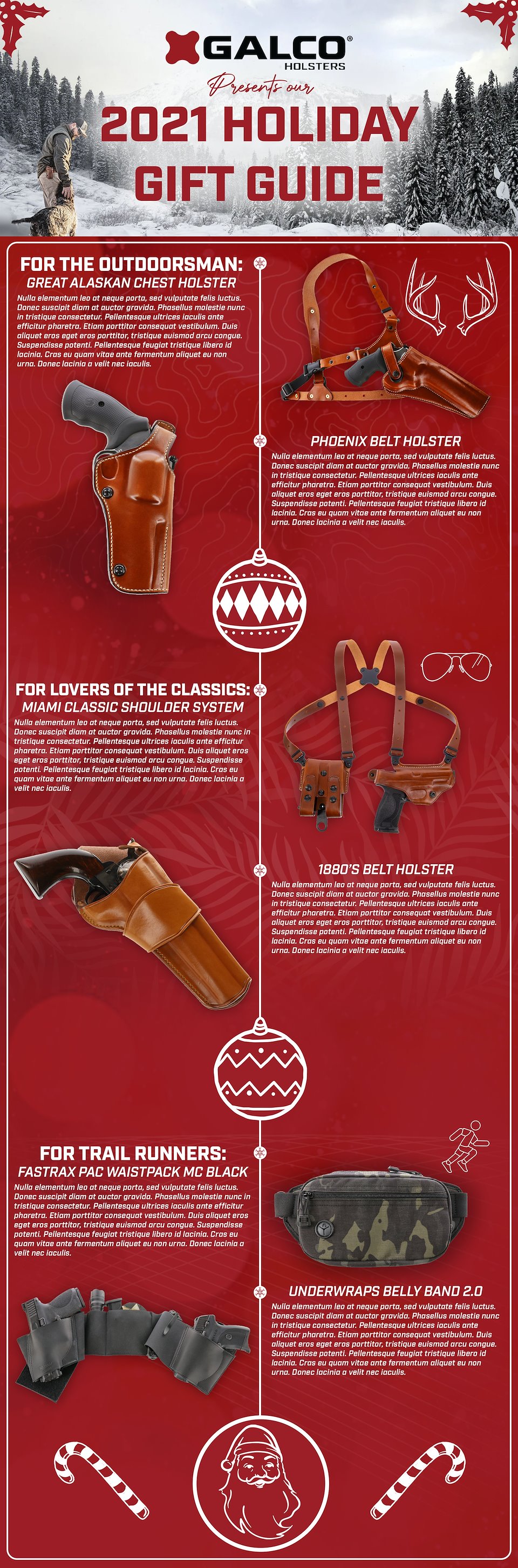 With a bit more freedom to spread the designs out and give them some breathing room as the email allowed for a very long format, I had some fun with a cleaner white look and the addition of some of my photography for the bottom present pile of products. I liked the graphic textures in the previous red variant, but the very subtle snow texture allowed more focus on the products themselves and let the tan leather 'pop' better.
